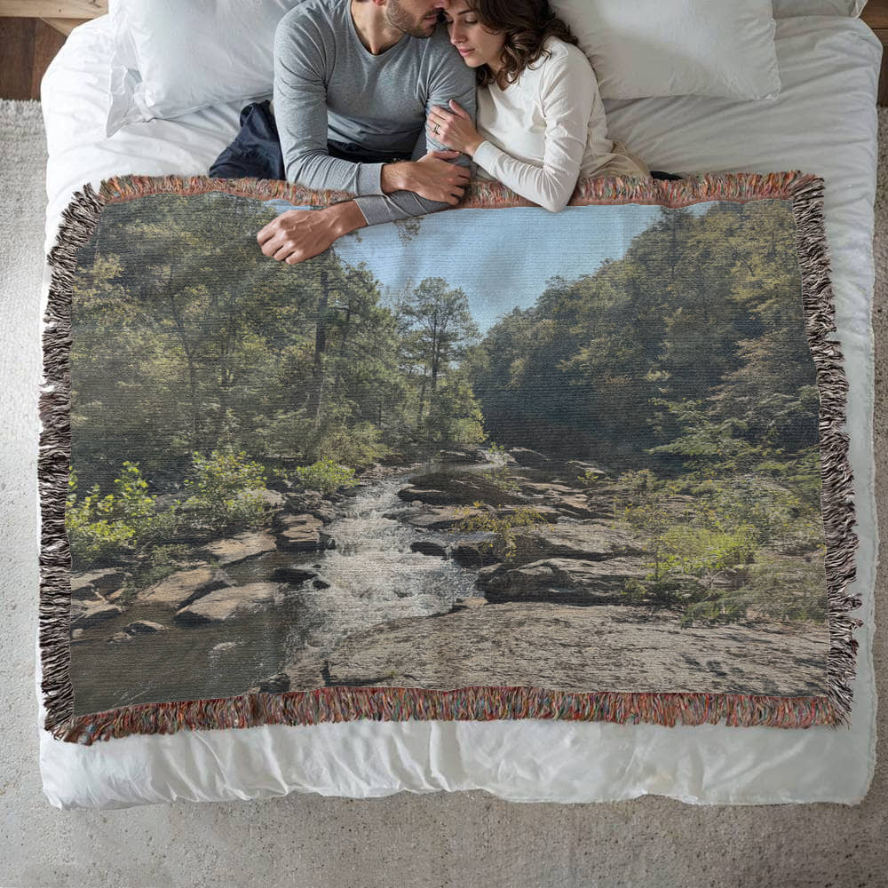 The Creekside Escape Woven Tapestry Blanket transforms our original photograph of a sparkling creek in Talladega National Forest near Talladega, Alabama into a timeless piece of art. Sunlight filters through towering trees and dances across mossy rocks, captured in rich, enduring color and texture. Woven on a traditional jacquard loom from 100 percent cotton yarn, it’s soft and substantial for everyday comfort, yet detailed enough to hang as a nature-inspired work of art.